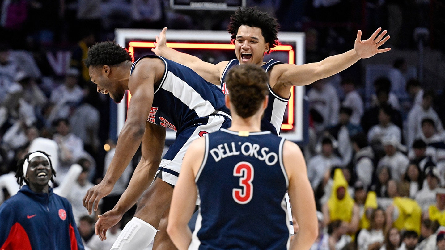 Arizona guard Brayden Burries raises his arms in celebration with Arizona forward Tobe Awaka, left, and Arizona guard Anthony Dell’Orso at the end of the first half of an NCAA college basketball game against UConn in Storrs, Conn., Nov. 19, 2025. (Jessica Hill/AP Photo)