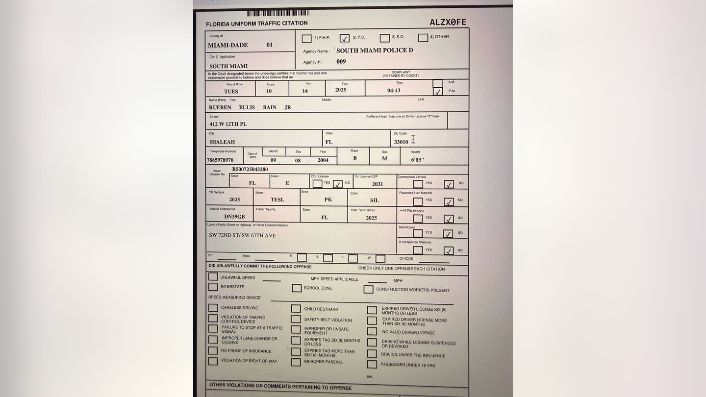 In addition to the March 2024 accident, court records show that Bain Jr. received a citation on October 10, 2025, driving a 2025 Tesla Cybertruck, in which he was again cited for negligent driving. The citation, shown below, lists a violation of Florida Statute 316.1925(1), which is reckless driving.