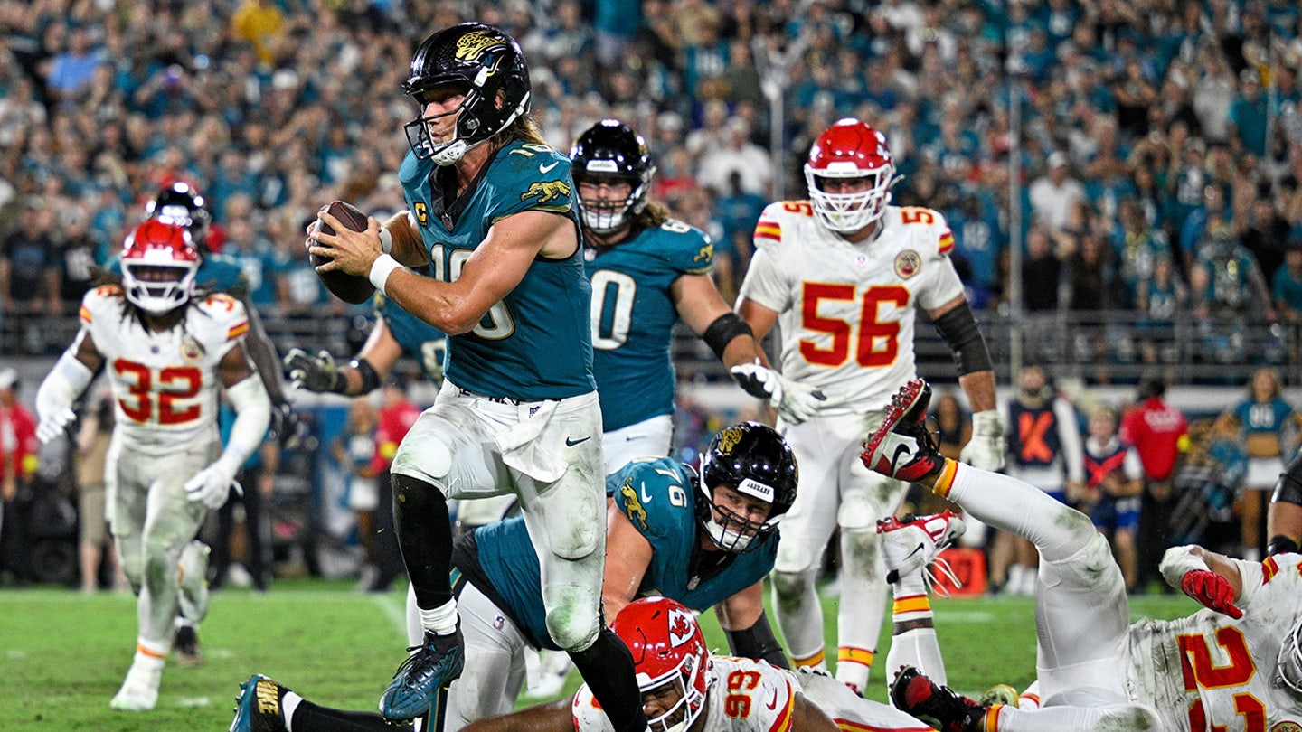 Jacksonville Jaguars quarterback Trevor Lawrence (16) runs for a touchdown during the second half of an NFL football game against the Kansas City Chiefs. The game took place in Jacksonville, Florida on October 6, 2025. (Phelan M. Ebenhack/AP Photo)