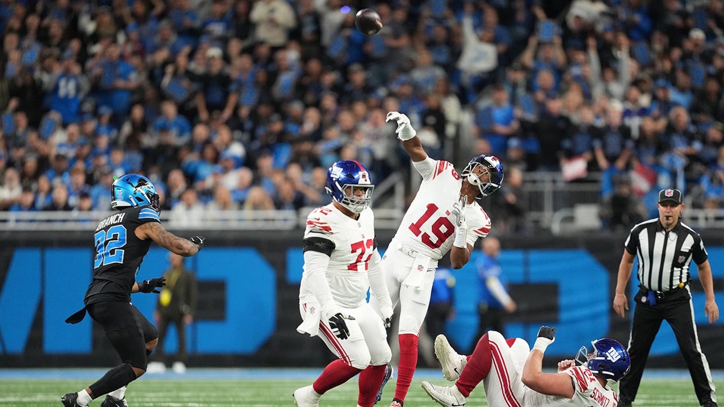 Jameis Winston #19 of the New York Giants throws a pass against the Detroit Lions during the first quarter at Ford Field on November 23, 2025 in Detroit, Michigan. (Nic Antaya/Getty Images)