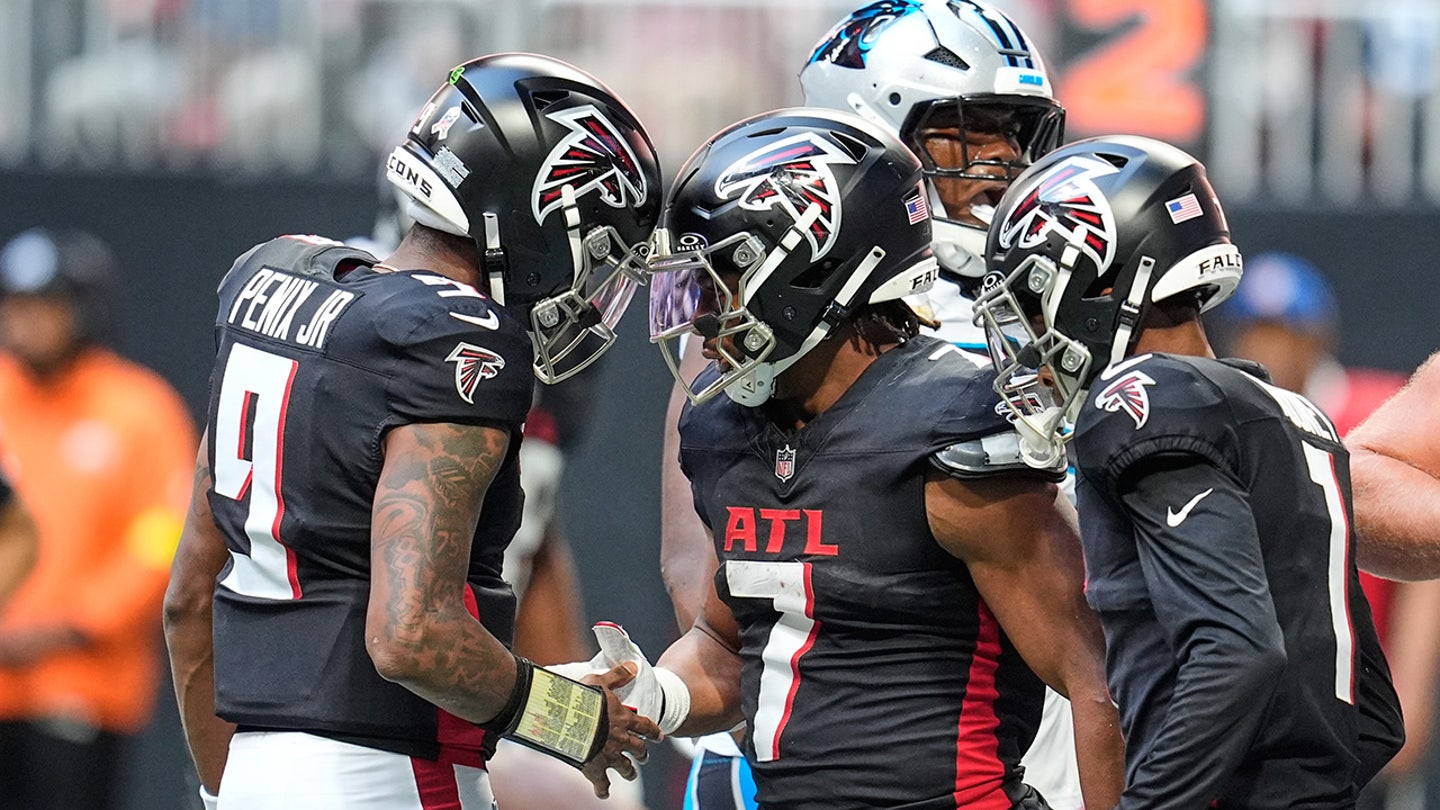 Atlanta Falcons running back Bijan Robinson (7) celebrates his touchdown with quarterback Michael Penix Jr. (9) in the first half of an NFL football game against the Carolina Panthers, Sunday, Nov. 16, 2025, in Atlanta. (AP Photo/Mike Stewart)