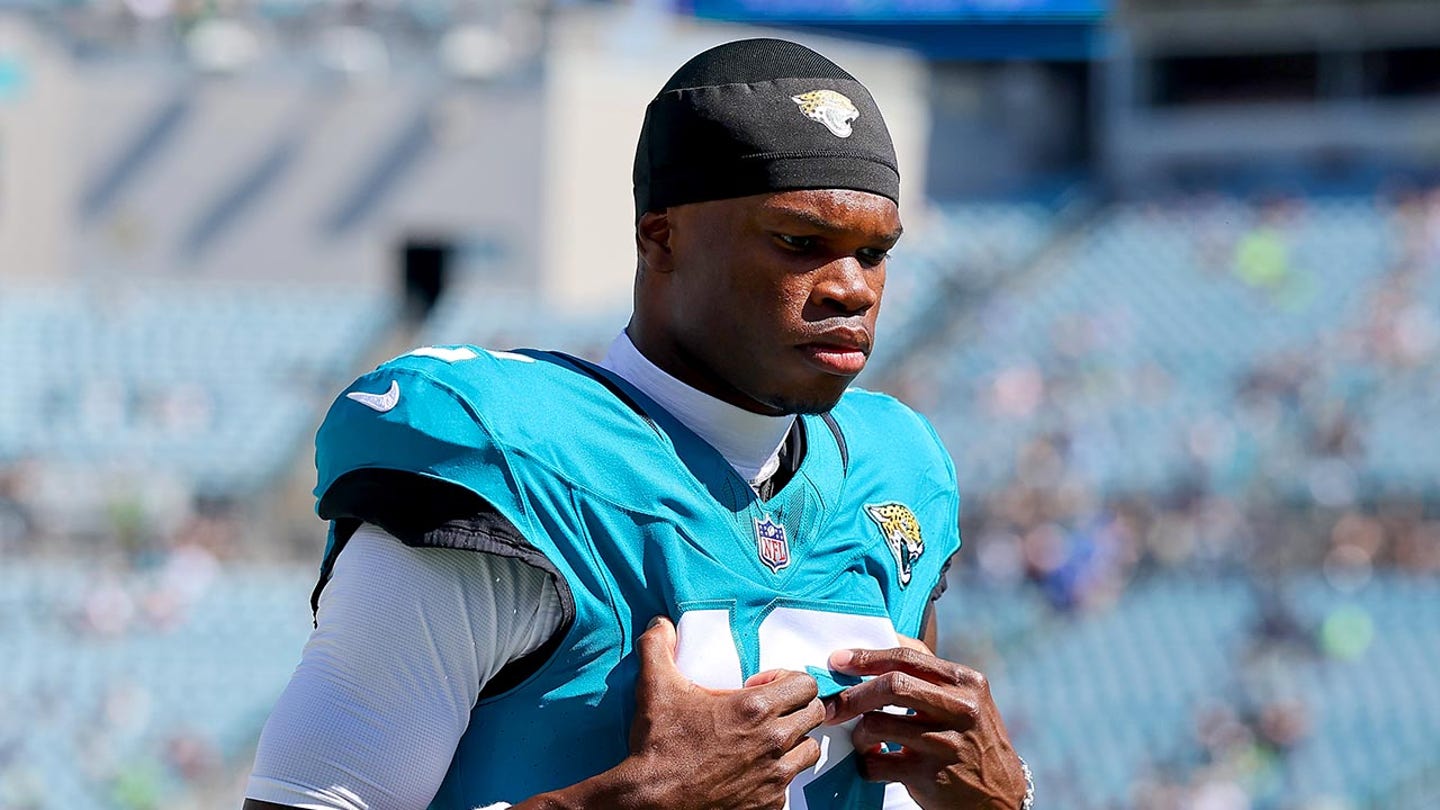Travis Hunter of the Jacksonville Jaguars warms up before the game against the Seattle Seahawks at EverBank Stadium in Jacksonville, Florida, on October 12, 2025. (Mike Carlson/Getty Images)