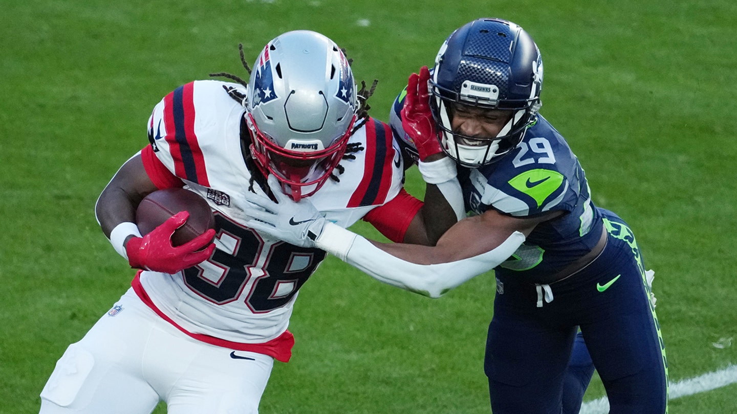 New England Patriots running back Rhamondre Stevenson (38) is tackled by Seattle Seahawks cornerback Josh Jobe (29) in the first half of Super Bowl LX at Levi’s Stadium. (Kirby Lee/Image Images)