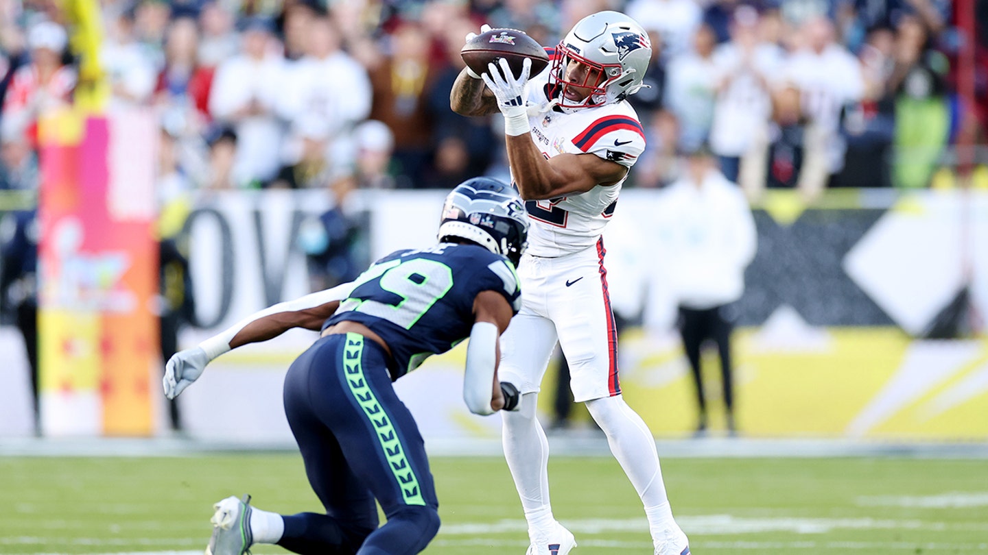 Treveyon Henderson of the New England Patriots catches a pass against Josh Jobe of the Seattle Seahawks during the first quarter of Super Bowl LX at Levi’s Stadium on February 8, 2026, in Santa Clara, California. (Kevin C. Cox/Getty Images)