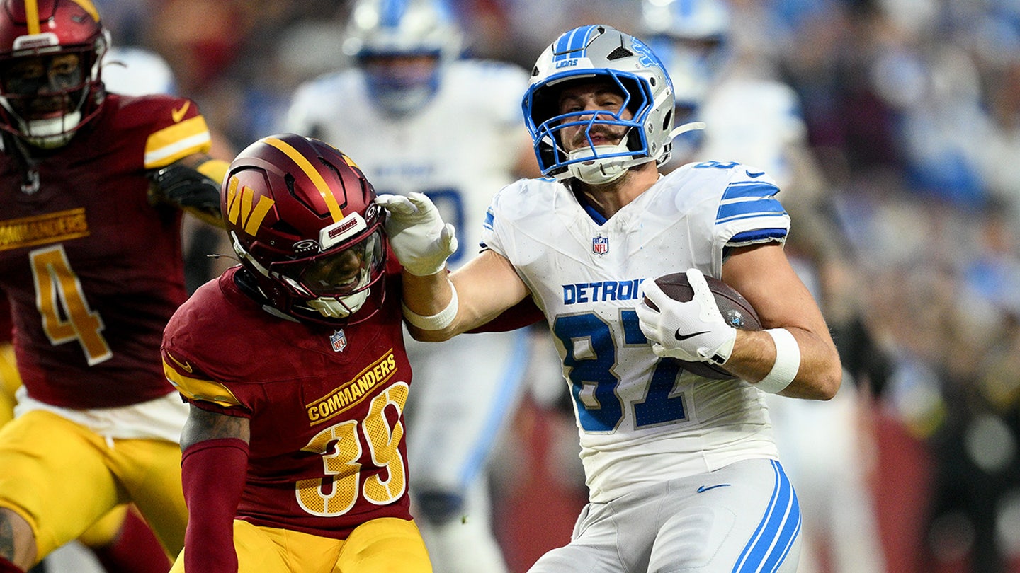 Detroit Lions tight end Sam LaPorta runs with the ball after catching it as Washington Commanders safety Jeremy Reaves (39) defends during the first half of an NFL football game in Landover, Maryland, on Nov. 9, 2025. (Nick Wass/AP Photo)