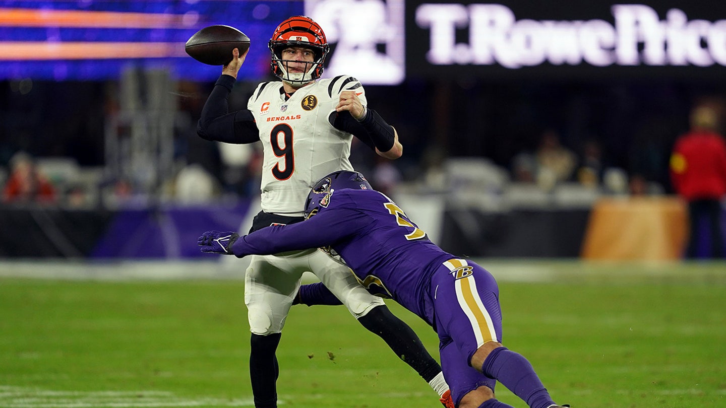 Cincinnati Bengals quarterback Joe Burrow (9) throws a pass against Baltimore Ravens linebacker Kyle Van Noy (53) during the second half at M&T Bank Stadium in Baltimore, Maryland, on Nov. 27, 2025. (Mitch Stringer/Image Images)