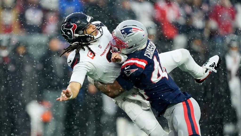 New England Patriots linebacker K’lavon Chaisson, right, hits Houston Texans quarterback CJ Stroud during the first half of an NFL divisional playoff football game, Sunday, Jan. 18, 2026, in Foxborough, Massachusetts. (AP Photo/Robert F. Bukaty)