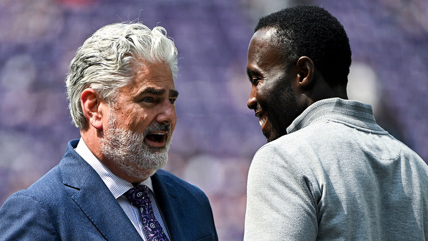 Minnesota Vikings radio announcer Paul Allen (left) greets general manager Kwesi Adofo-Mensah (right) before the preseason game against the Las Vegas Raiders at US Bank Stadium in Minneapolis, Minnesota, on August 10, 2024. (Stephen Maturen/Getty Images)