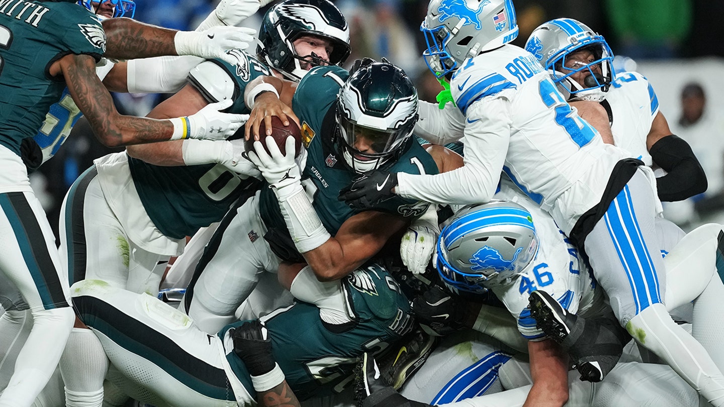 Goff was 14-for-37 with a touchdown pass to Jameson Williams and an interception to Cooper DeJean. Jaelan Phillips and Nakobe Dean recorded sacks on Goff. Eagles defenders deflected 10 of Goff’s passes. Philadelphia’s Jordan Davis had three deflections.