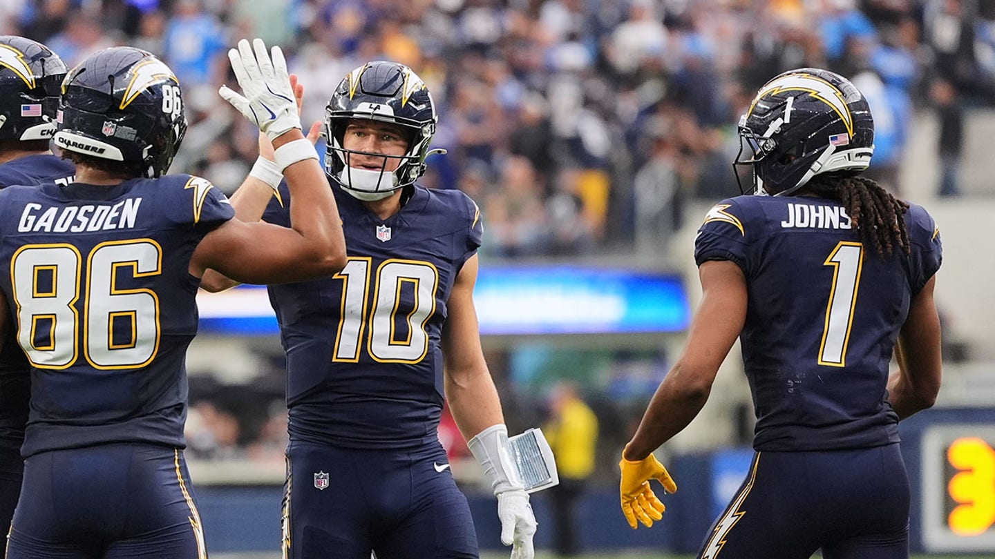 Los Angeles Chargers quarterback Justin Herbert (10) celebrates with tight end Oronde Gadsden II (86) after throwing a touchdown during the second half of an NFL football game against the Las Vegas Raiders, Sunday, Nov. 30, 2025, in Inglewood, California. (AP Photo/Jae C. Hong)