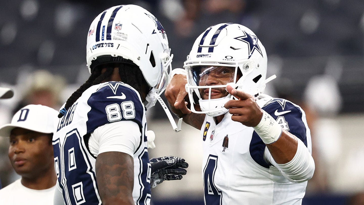 Dallas Cowboys quarterback Dak Prescott (4) talks with receiver Ceedee Lamb (88) during warmups before the game against the Washington Commanders at AT&T Stadium on Oct. 19, 2025. (Images by Kevin Jairaj-Imagn)