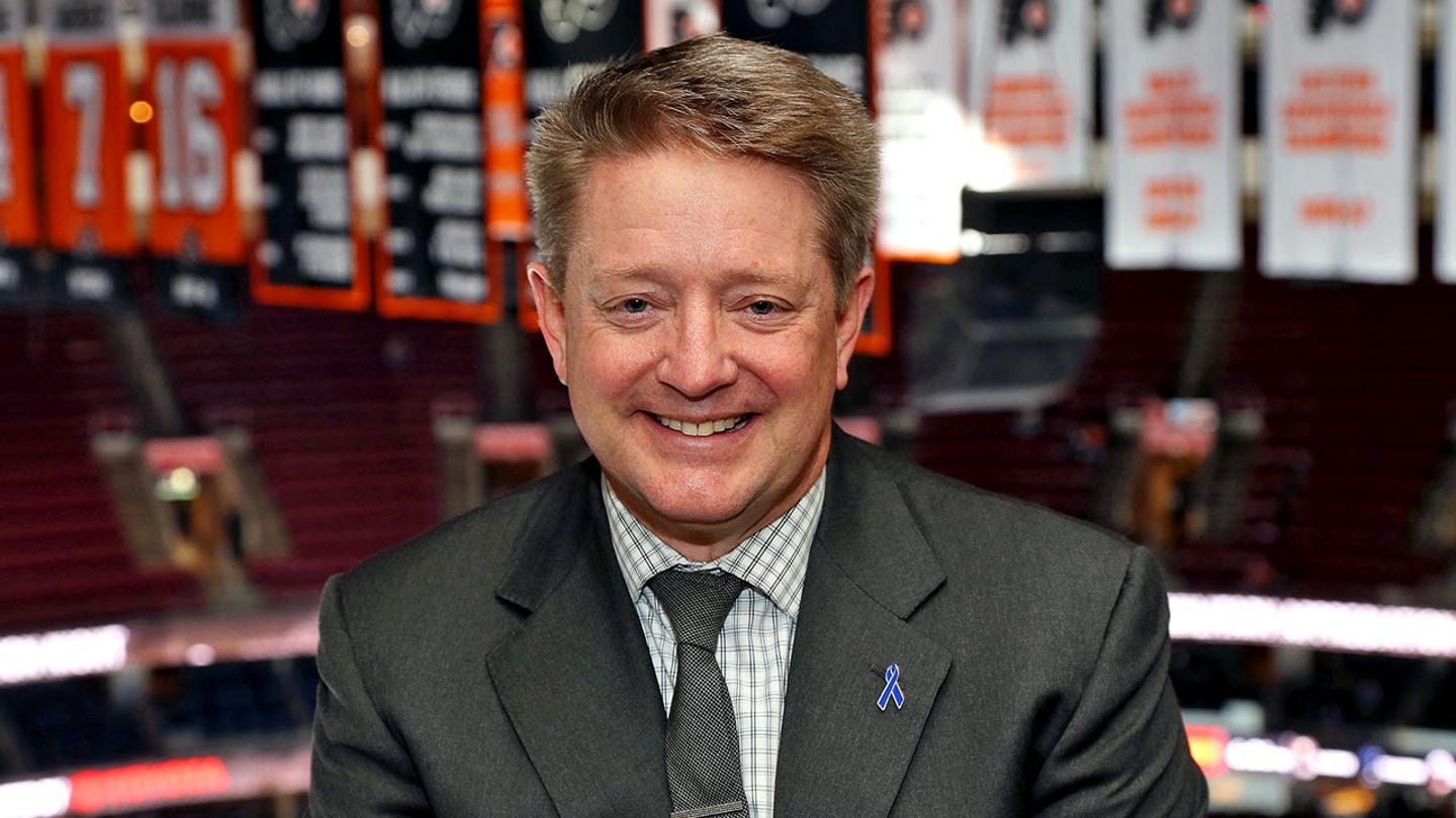 Tim Saunders hosts a pregame ceremony honoring Steve Coates, a 43-year career as a member of the Philadelphia Flyers broadcast team, at the Wells Fargo Center in Philadelphia, Pennsylvania, on April 1, 2023. (Len Redkoles/NHLI via Getty Images)