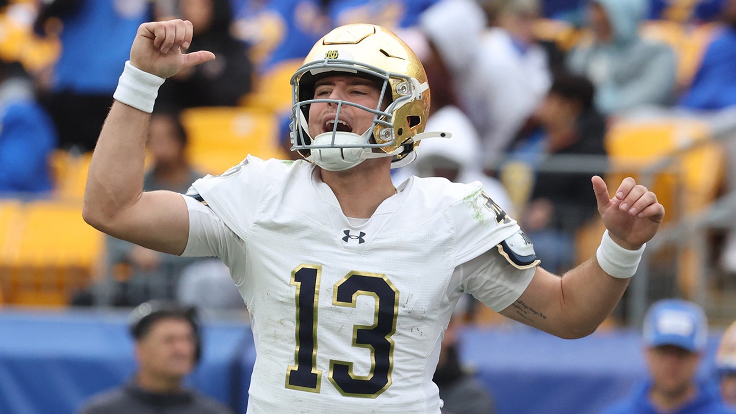 Notre Dame Fighting Irish quarterback CJ Carr (13) makes an audible at the line of scrimmage against the Pittsburgh Panthers during the fourth quarter at Acrisure Stadium on Nov. 15, 2025. (Charles LeClaire/Image Images)
