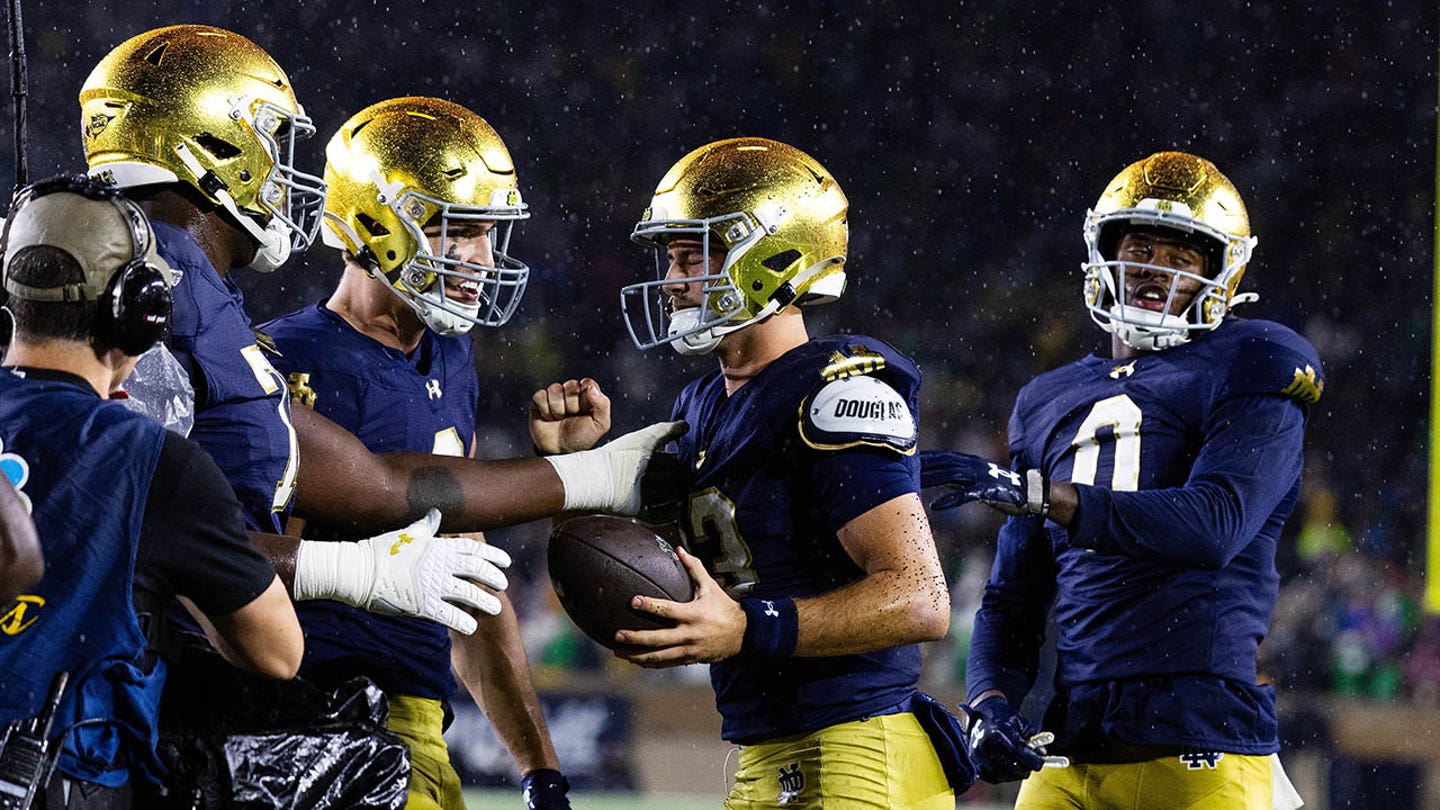 Notre Dame Fighting Irish quarterback CJ Carr (13) celebrates his touchdown with teammates in the second half at Notre Dame Stadium on Oct. 18, 2025. (Trevor Ruszkowski/Image Images)