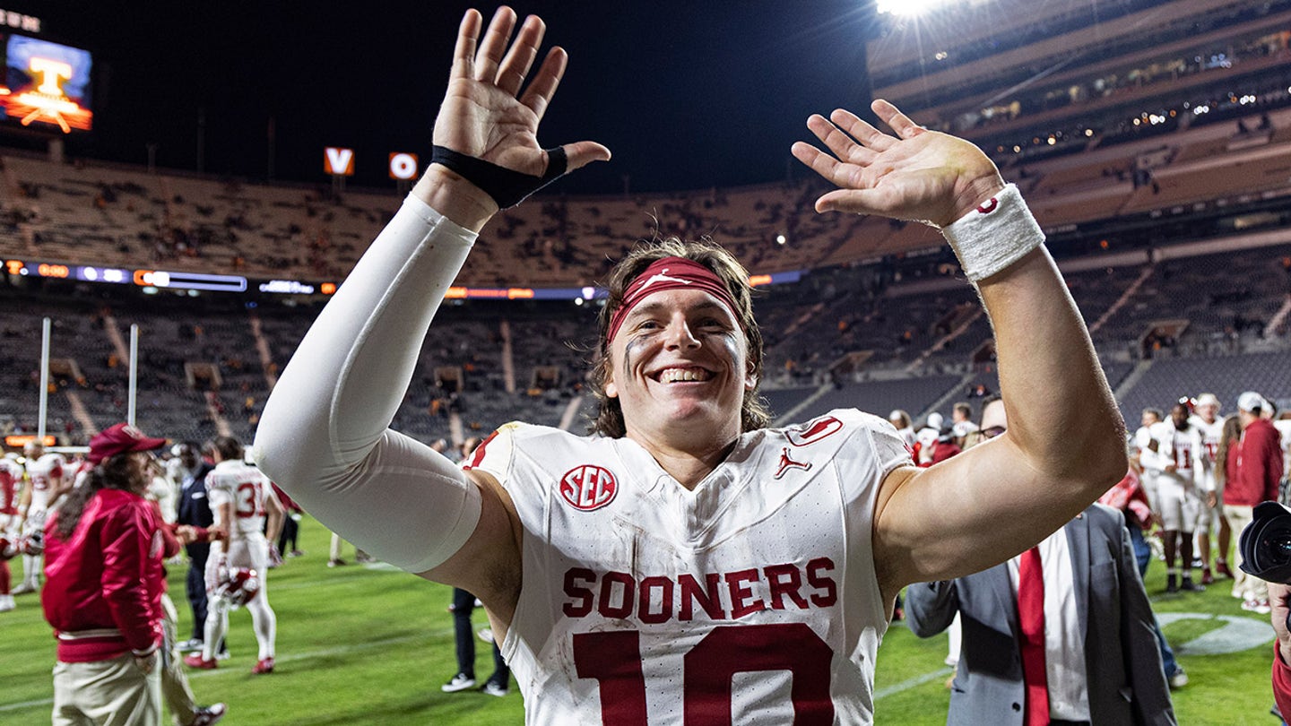 Oklahoma quarterback John Mateer (10) waves to fans after his team defeated Tennessee 33-27 in an NCAA college football game Saturday, Nov. 1, 2025, in Knoxville, Tennessee. (AP Photo/Wade Payne)
