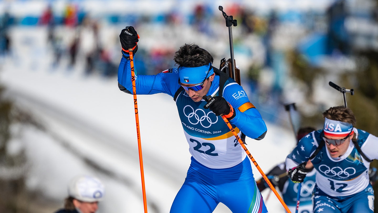 Tommaso Giacomel of Team Italy in action during the Men’s 12.5 km Pursuit on day nine of the Milan Cortina 2026 Olympic Winter Games at Anterselva Biathlon Arena on February 15, 2026 in Antholz-Anterselva, Italy. (Kevin Voigt/Getty Images)