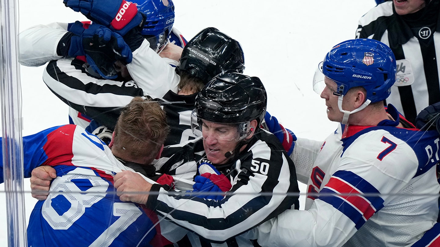 Line judge Scott Cherrey (50) tries to separate Slovakia’s Erik Cernak (81) and American Brady Tkachuk (7) during the third period of a men’s ice hockey semifinal game at the 2026 Winter Olympics in Milan, Italy, Feb. 20, 2026. (Carolyn Kaster/AP Photo)
