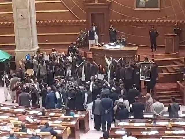 The opposition legislators gathered outside the assembly building, sing slogans against the Government led by PML-N and denouncing what they described as anti-democratic conduct.