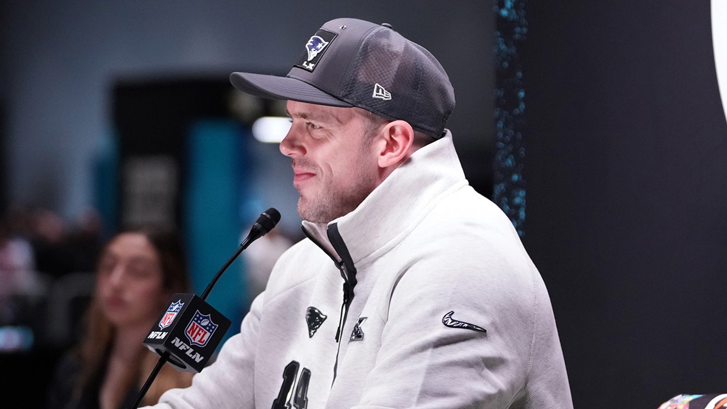 New England Patriots linebacker Robert Spillane (14) speaks to the media during opening night of Super Bowl LX at the San Jose Convention Center on February 2, 2026 in San Jose, California. (Cary Edmondson/Image Images)