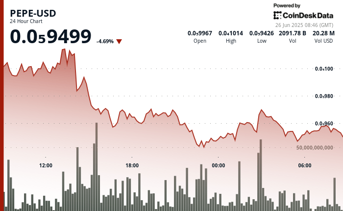 • PEPE-USD quoted within a range of 16.1%, falling from $ 0.00001017 to $ 0.00000940 between June 25 09:00 and June 26 08:00 UTC.
