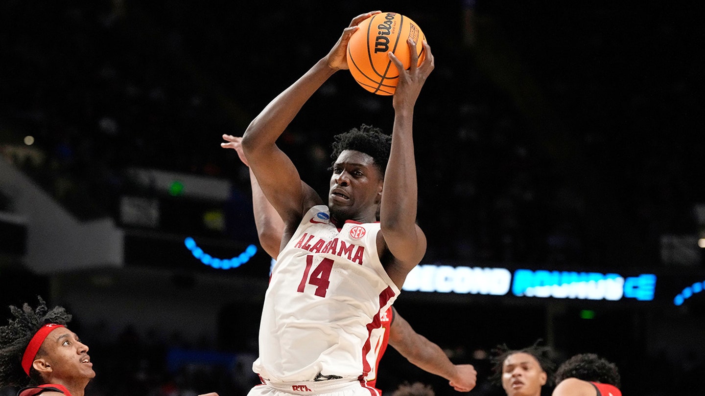 Alabama center Charles Bediako (14) pulls down a rebound while guarded by Maryland guard Ian Martinez, left, during the second half of a second-round college basketball game in the men’s NCAA tournament. The game was played in Birmingham, Alabama on March 18, 2023. (Rogelio V. SolĂs/AP Photo, File)