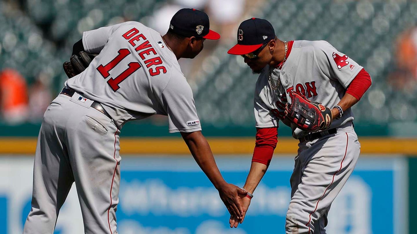 The right gardener of the Red Sox of Boston, Mookie Betts, #50, celebrates with the third base Rafael Devers, #11, after the game against Detroit’s tigers in Edenica Park in Detroit on July 7, 2019. (Raj Mehta-USA Today Sports)