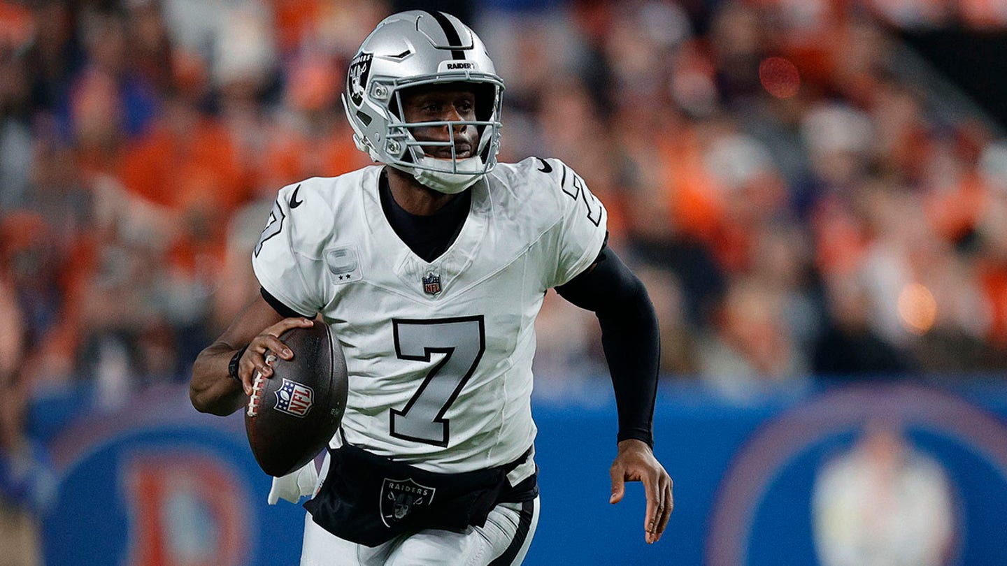 Las Vegas Raiders quarterback Geno Smith warms up before a game against the Cleveland Browns at Allegiant Stadium in Paradise, Nevada, on Nov. 23, 2025. (Stephen R. Sylvanie/Imagn Images)