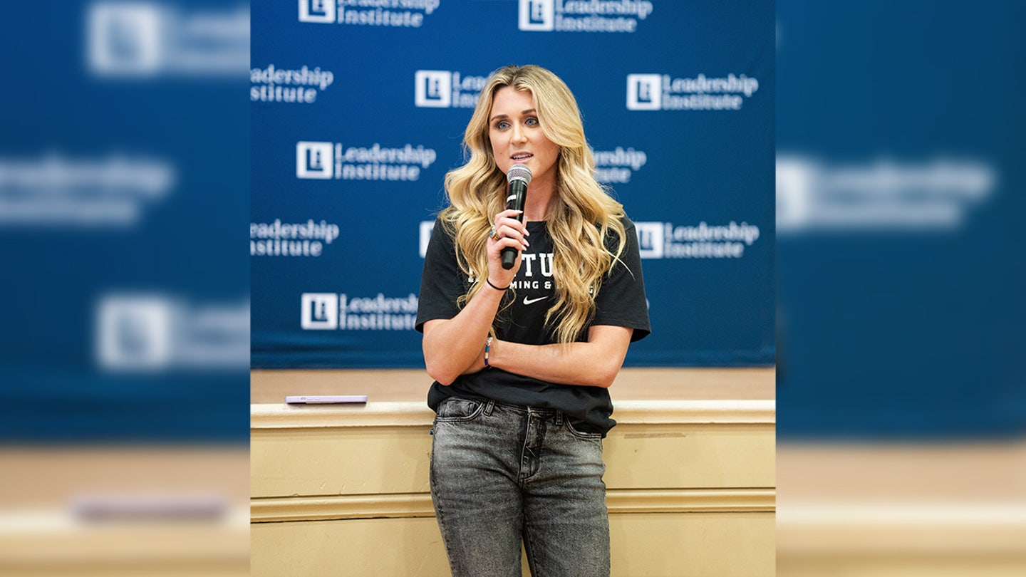 The former swimmer of the University of Kentucky, Riley Gaines, speaks in an event. (The Leadership Institute)