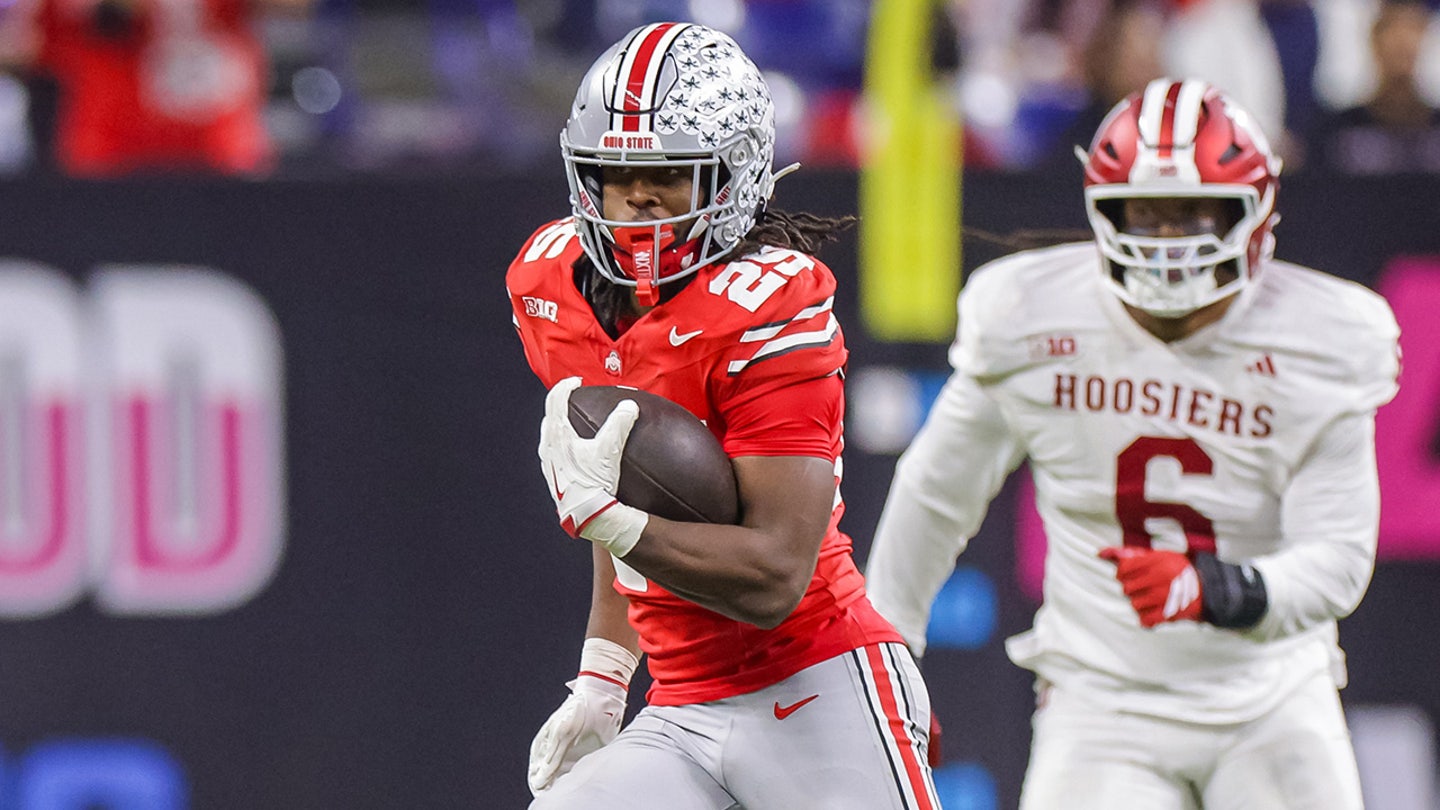 Bo Jackson #25 of the Ohio State Buckeyes runs the ball against the Indiana Hoosiers in the 2025 Big Ten Championship game at Lucas Oil Stadium on December 6, 2025 in Indianapolis, Indiana. (Michael Hickey/Getty Images)