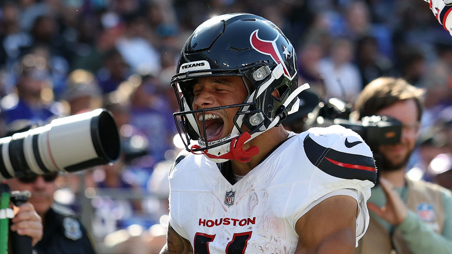 Jaylin Noel of the Houston Texans celebrates a TouchDown pass during the fourth quarter against the Baltimore Ravens in the game at the M&T Bank Stadium on October 5, 2025 in Baltimore, Maryland. (Rob Carr/Getty Images)
