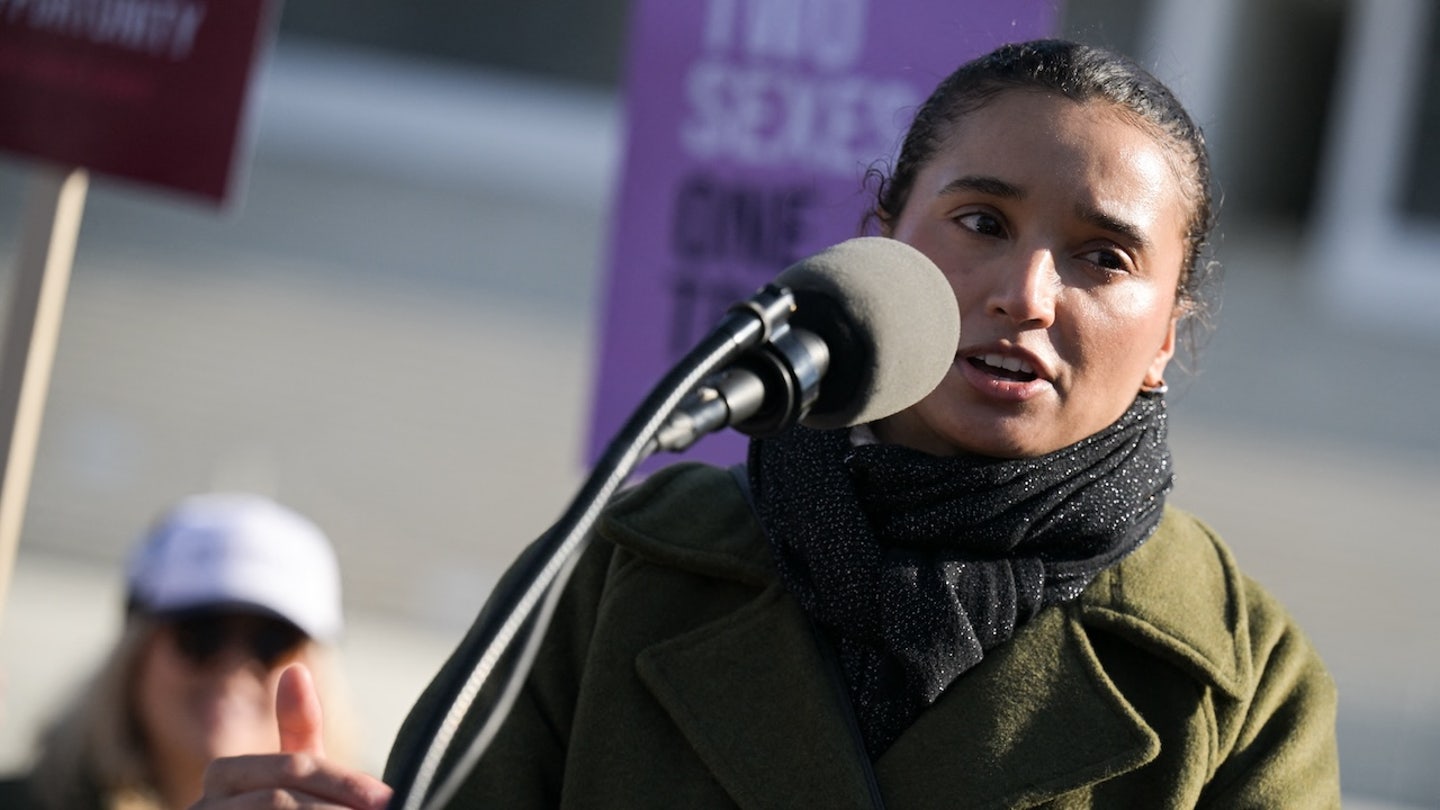 Stephanie Turner, an American fencer who refused to compete against a transgender athlete in high school, speaks in front of the U.S. Supreme Court as justices hear arguments in challenges to state bans on transgender athletes in women’s sports on January 13, 2026, in Washington, DC. (Oliver Contreras/AFP)