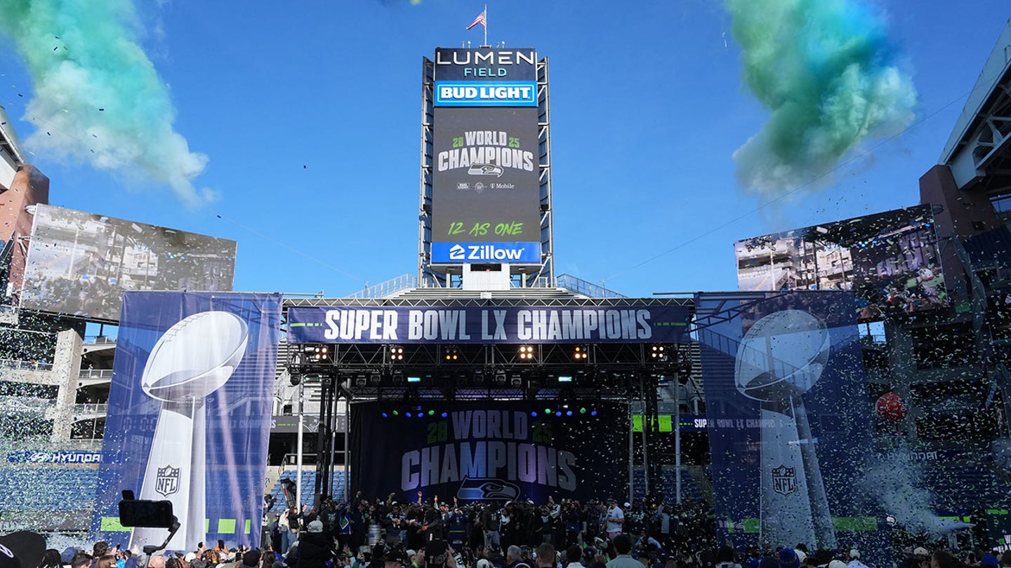 The Super Bowl LX trophy celebration at Lumen Field on February 11, 2026 in Seattle. (Kirby Lee/Image Images)