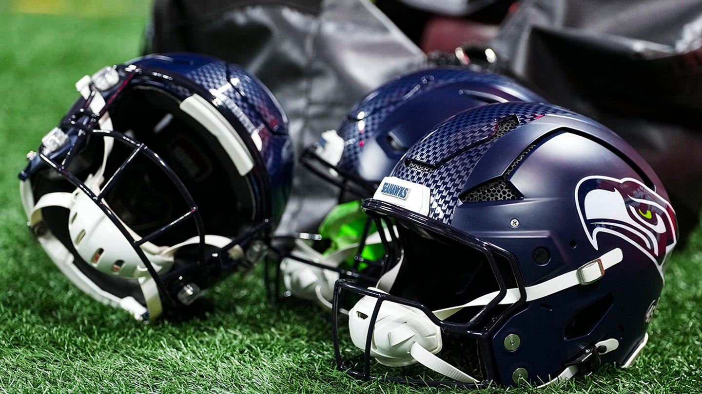 Seattle Seahawks helmets before a game between the Seahawks and the Atlanta Falcons at Mercedes-Benz Stadium on December 7, 2025 in Atlanta. (Perry Knotts/Getty Images)