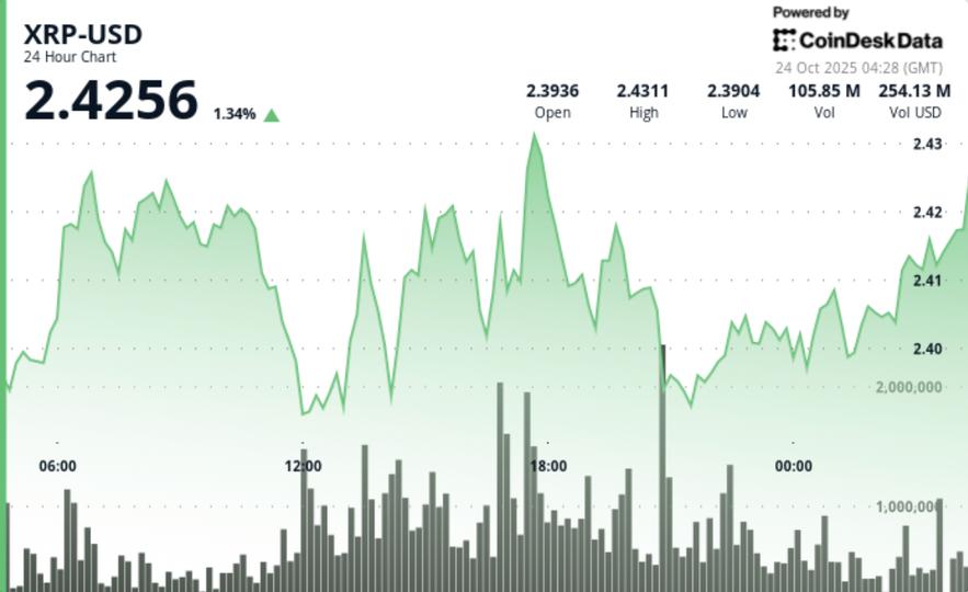 - Hourly data shows a slight bullish bias, with XRP advancing from $2,397 to $2,405 around 01:47 on high volume.