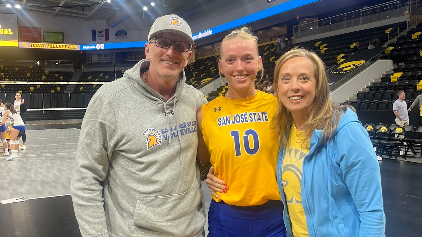 Former SJSU volleyball star Brooke Slusser and her parents Paul and Kim Slusser at a game on September 8, which Kim said is “the last good memory we have of her playing.” (Courtesy of Kim Slusser)