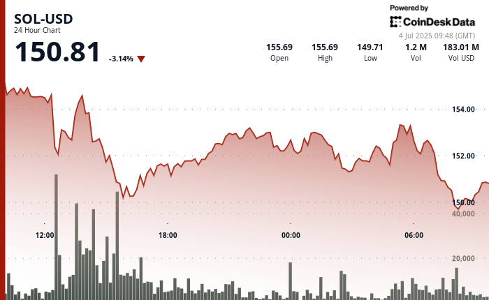- Sol fell 3.36% of $ 155.69 to $ 150.46 during the 24 -hour period from July 3 to 10:00 a.m. to July 4 at 09: 00.P