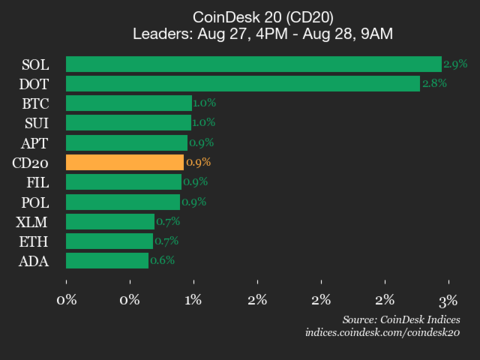 COINDESK Indices presents its daily market update, highlighting the performance of leaders and lagging behind the Coindesk 20 index.