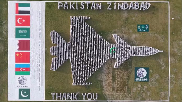 Citizens in Jhang exhibited a spectacular human formation of the J-10C combat plane to pay a tribute to the Pakistan Air Force (PAF) and the country’s closest allies after the Armed Forces gave a decisive response to Indian aggression.
