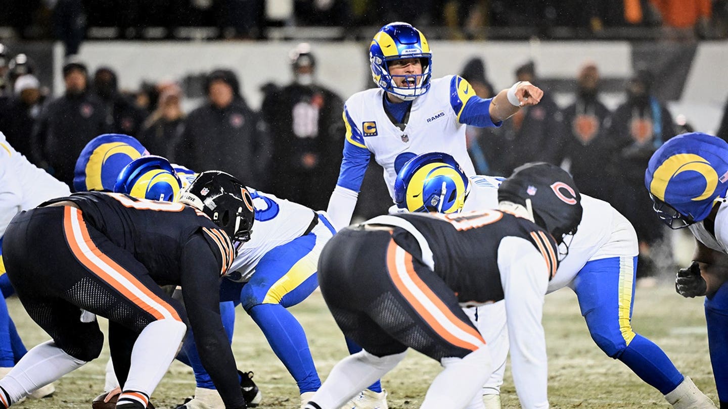 Los Angeles Rams quarterback Matthew Stafford signals during the Bears game at Soldier Field in Chicago on January 18, 2026. (Matt Marton/Image Images)