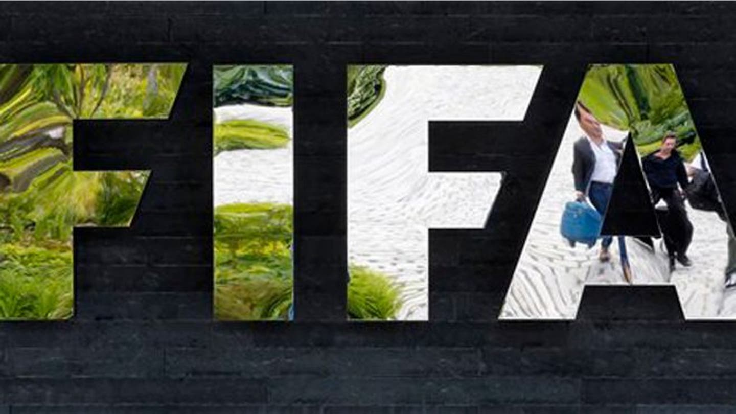 FILE – In this May 27, 2015, file photo, two people are reflected in the FIFA logo at the FIFA headquarters in Zurich, Switzerland. (AP Photo/Michael Probst, File)
