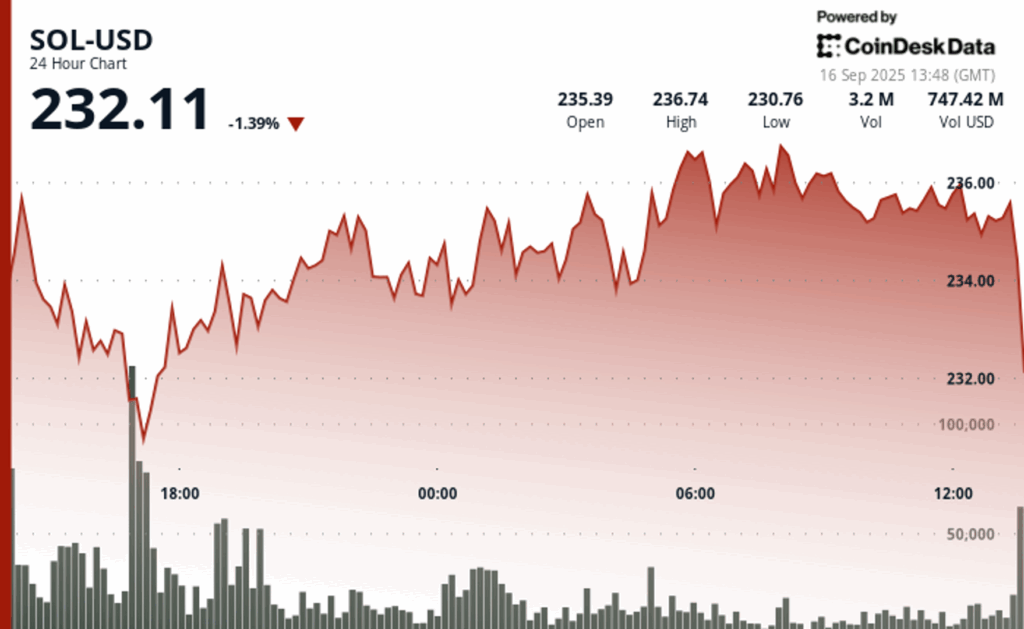The last 24 -hour Coendesk data picture, which ends at 12:30 UTC on September 16, shows Sol to $ 232.11 after withdrawing from an intradic area of $ 236– $ 237. Trade was reduced in the $ 232– $ 234 band, reinforcing that area as a short -term support.