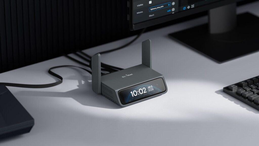 The touch screen and dual Ethernet features echo designs seen on GL.iNet Slate 7 Portable Router, while the concept of multi-network failover is refined from its Puli AX Cellular Router.