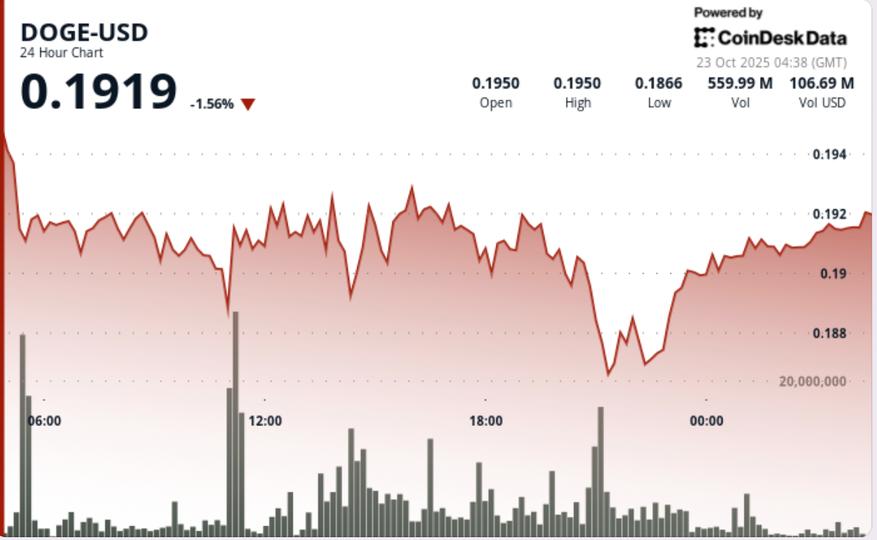 - Dogecoin fell 0.61% to $0.192 during the session on Tuesday, retreating from intraday highs of $0.195 as sellers limited gains at resistance.
