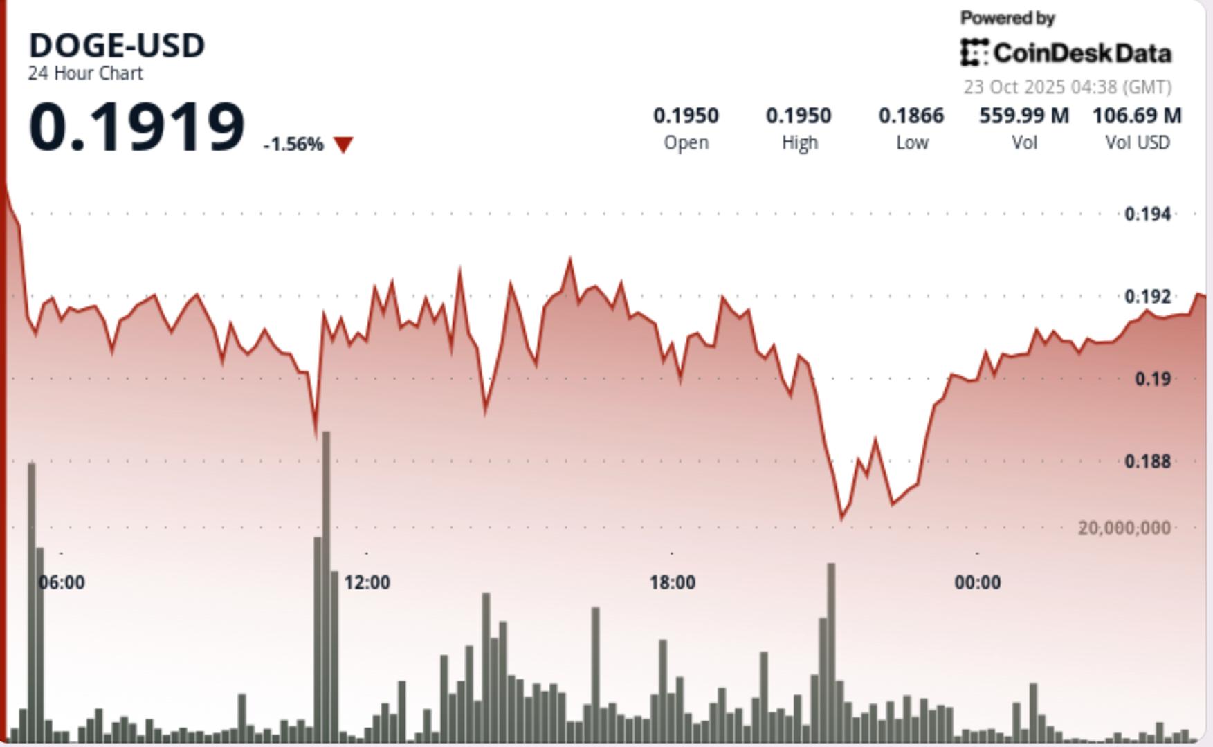 - Dogecoin fell 0.61% to $0.192 during the session on Tuesday, retreating from intraday highs of $0.195 as sellers limited gains at resistance.