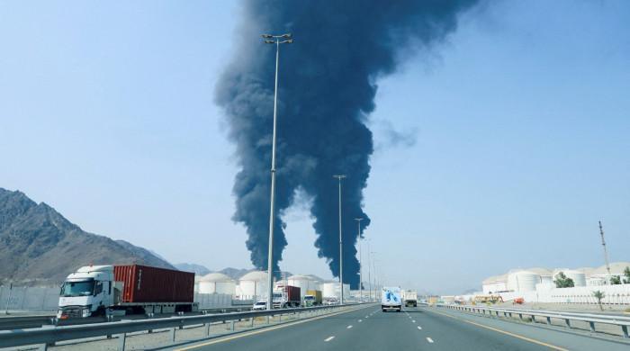 Smoke rises in the Fujairah oil industrial zone, caused by debris after the interception of a drone by air defences, according to the Fujairah media office, amid the US-Israel conflict with Iran, in Fujairah, United Arab Emirates, March 14, 2026. – Reuters