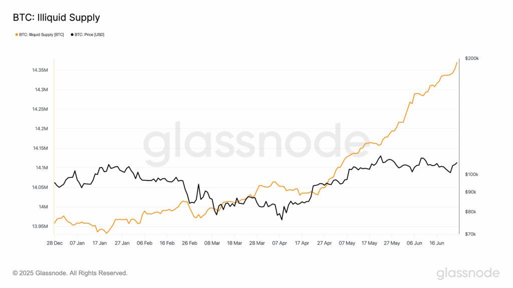 The Illiquid supply has increased to 14.37 million BTC, jumping from 13.9 million BTC at the beginning of 2025, according to Glassnode data.