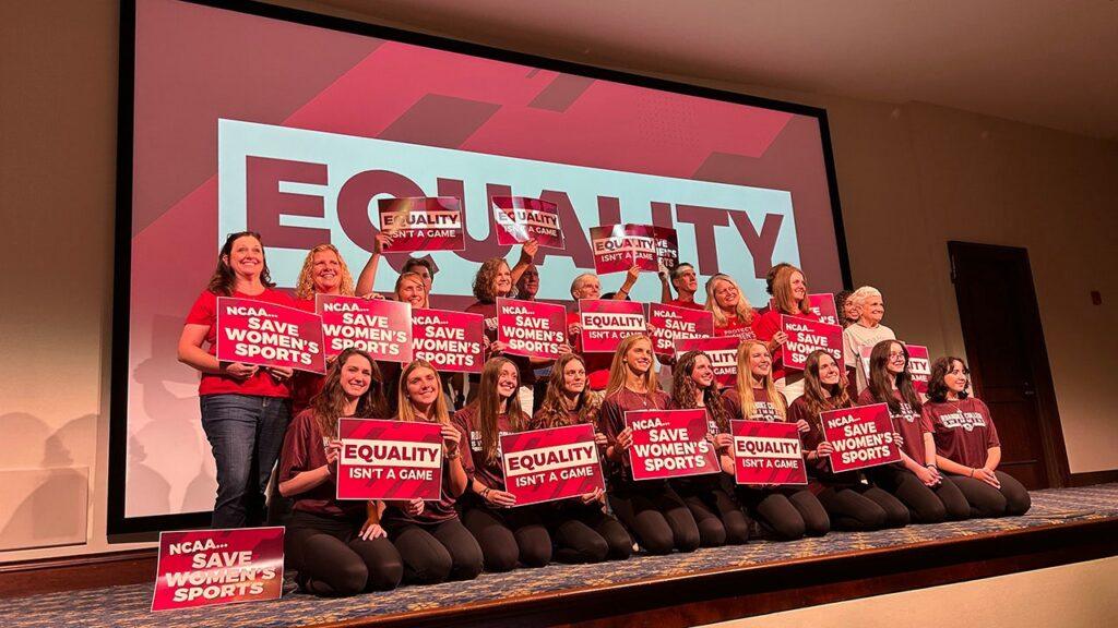 The members of the Swimming Team for Women Roanoke College attend a press conference. (Outkick)