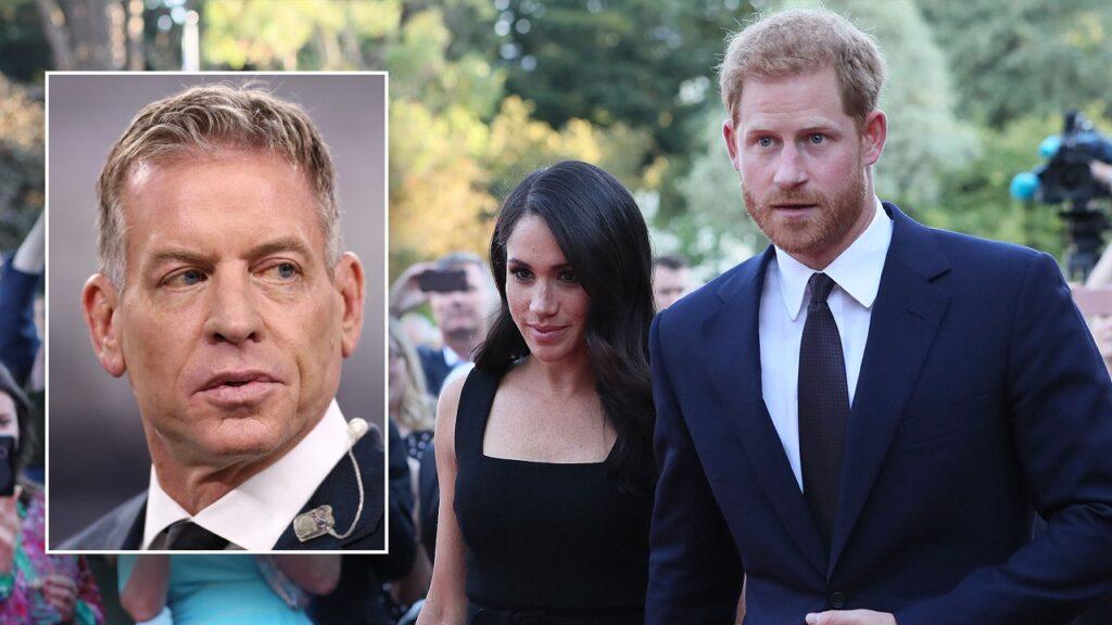 Troy Aikman doesn’t look too friendly with Prince Harry and Meghan Markle. (Imagn; Getty)