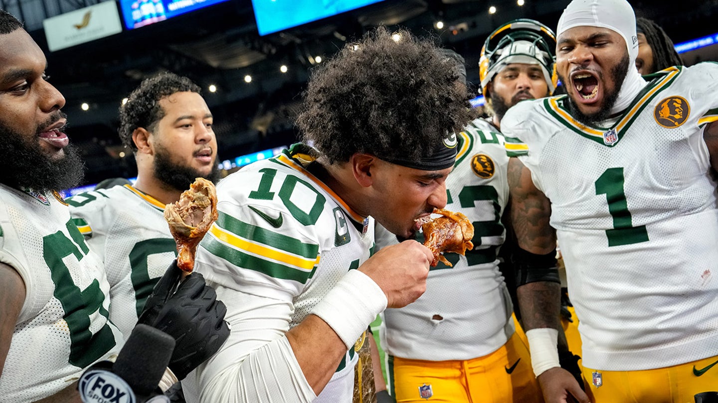 Jordan Love #10 of the Green Bay Packers takes a bite out of a turkey leg after the game against the Detroit Lions at Ford Field on November 27, 2025 in Detroit, Michigan. (Nic Antaya/Getty Images)
