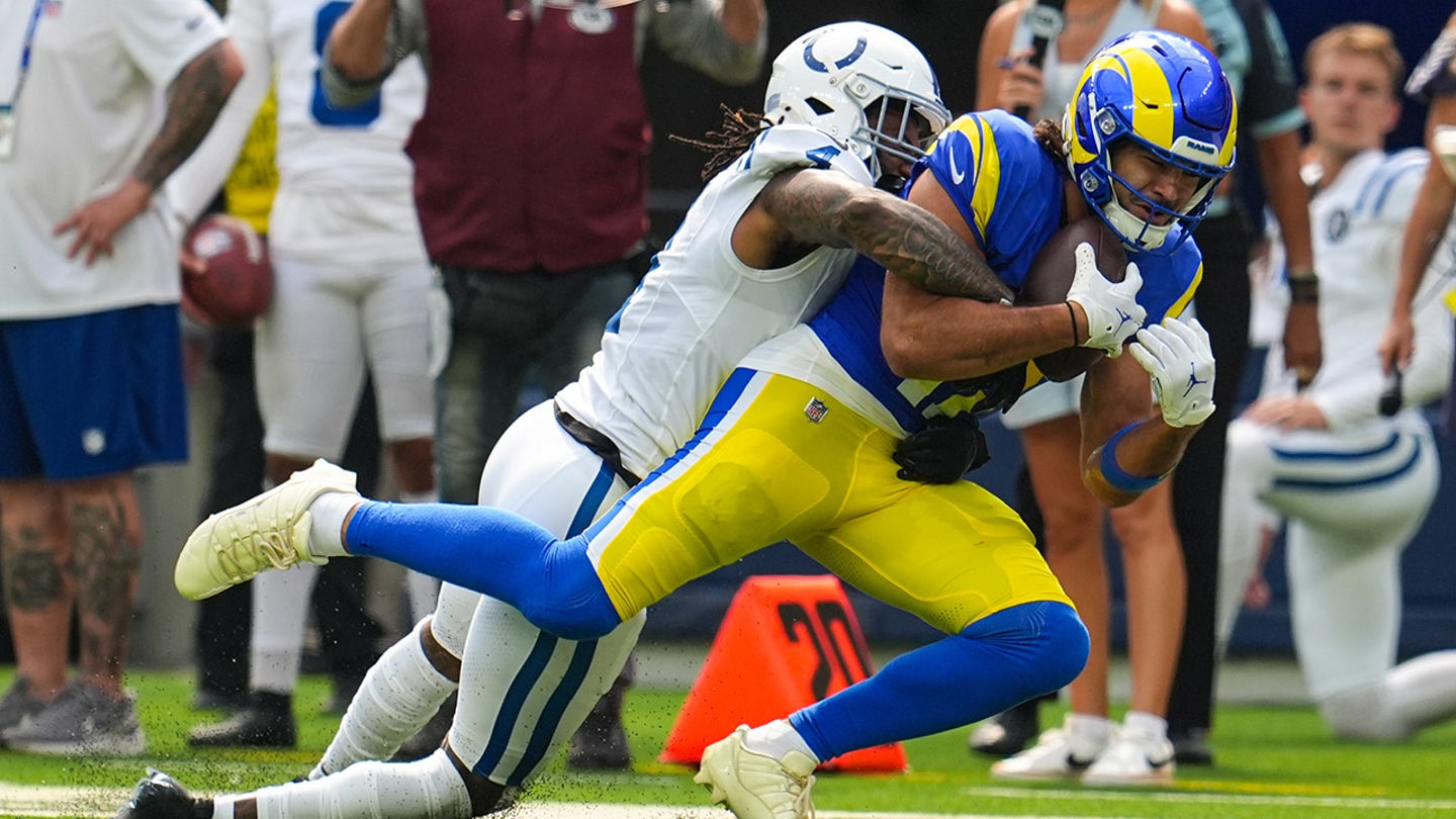 The open receiver of the Los Angeles Rams, Puka Nacua (12), makes a capture in front of the corner of Indianapolis Colts, Xavien Howard (4) during the first room of a NFL football match on Sunday, September 28, 2025, in Inglewood, California. (AP Photo/Marcio Jose Sánchez)